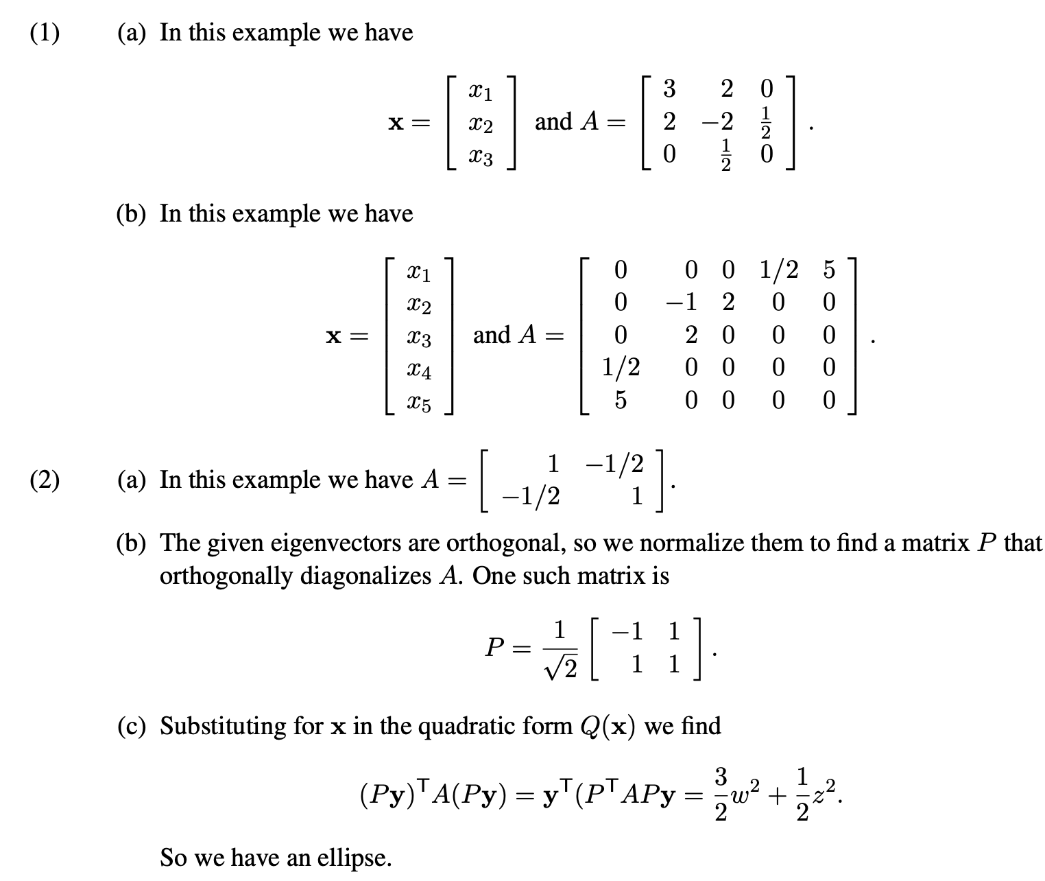 Theorem 1 (Principal Axis Theorem) Let \(A\) be an \(n\times n\) symmetric matrix. There is an orthogonal change of variables \(\x = P \y\) so that the quadratic form \(Q\) defined by \(Q(\x) = \tr{\x} A \x\) is transformed into the quadratic form \(\tr{\y} D \y\), where \(D\) is a diagonal matrix.
